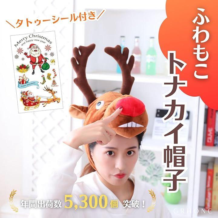 「年間5,300個出荷。被るだけでクリスマス気分MAXトナカイヘッドハット」上質な短毛ボア素材とPP綿を使用し、ふんわりやわらかな触り心地と保温性を両立。