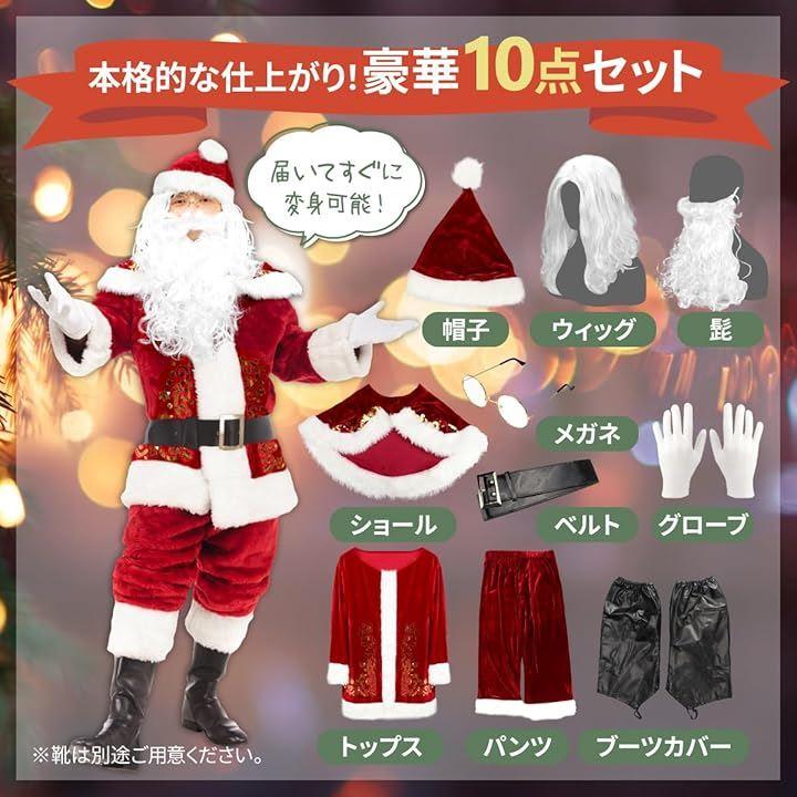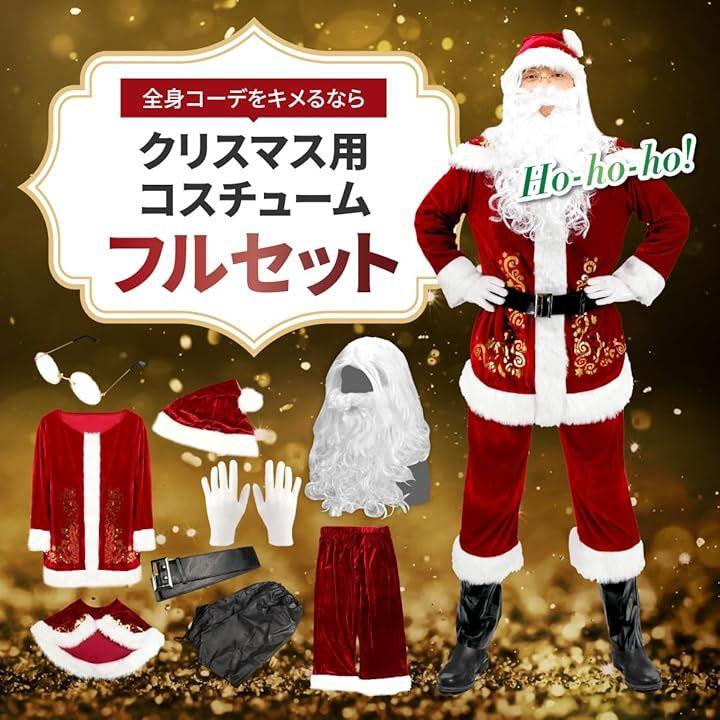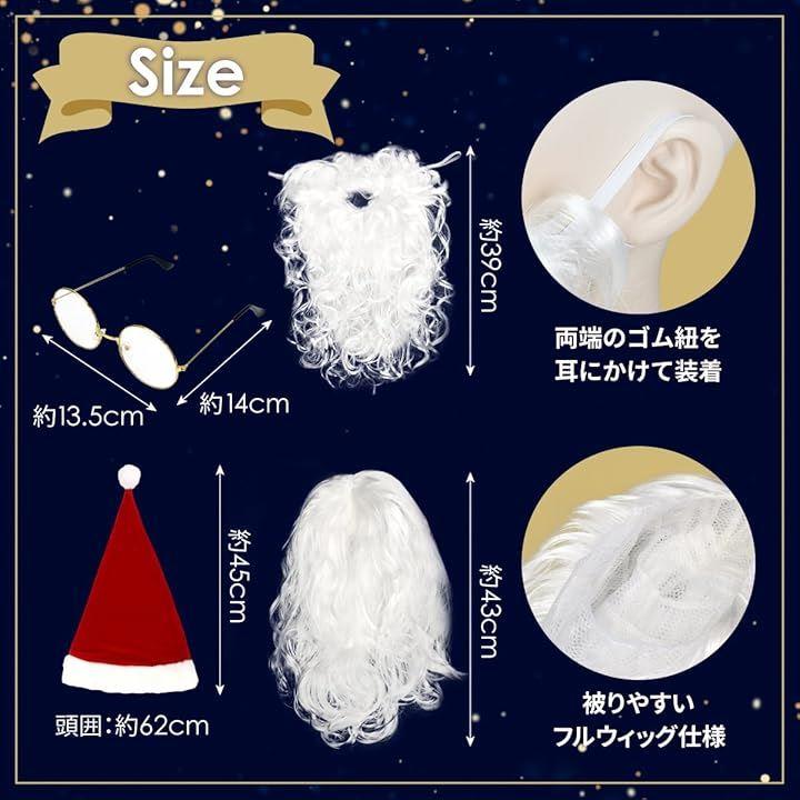 「セット内容」(1)フルセット:サンタ帽子/ショール/トップス/パンツ/ベルト/ブーツカバー/ウィッグ/髭/メガネ/グローブ(計10点) (2)簡易セット:サンタ帽子/ウィッグ/髭/メガネ(計4点) 「サイズ(約)」《XL》バスト:128cm/トップウエスト:128cm/パンツウエスト:82cm/ヒップ:120cm/肩幅:58cm/袖丈:56cm/ドレス丈:84cm/パンツ丈:79cm/帽子頭囲:60cm 《XXL》バスト: 136cm/トップウエスト:136cm/パンツウエスト:90cm/ヒップ:130cm/肩幅:62cm/袖丈:58cm/着丈:86cm/パンツ丈:81cm/帽子頭囲:60cm 素材:ポリエステル