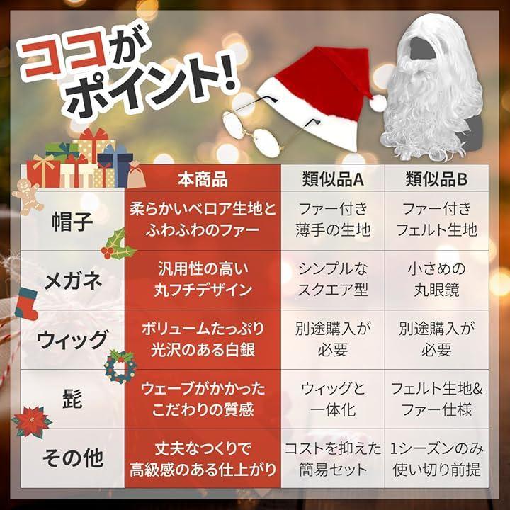 サンタクロースのトレードマークとなる帽子・髪の毛・髭を全て装着すると目元だけが出る仕様により、正体を隠せるのでサプライ性が高まります。