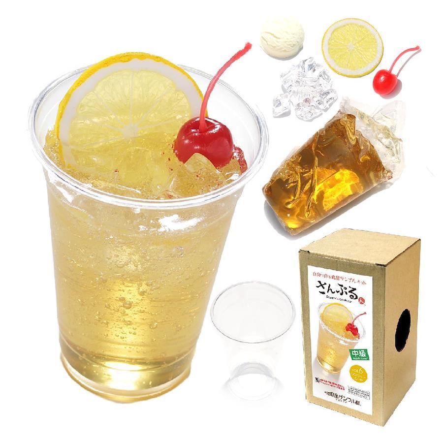【商品説明】ゼラチンのジュースパックでつくる食品サンプル「ジンジャーエール」の製作キットです。 【さんぷるんとは】「さんぷるん」は、熟練の食品サンプル職人が考案したご自宅で食品サンプルづくりを体験できるキットです。昔ながらの蝋(ロウ)や最新の樹脂素材など様々な材料が取り入れられています。 【内容物】・作り方説明書 1枚 ・ジュースパック(ゼラチン) 1個 ・カップ(PET) 1個 ・氷(プラ) 8個 ・チェリー(ビニール樹脂) 1個 ・レモン(ビニール樹脂) 1個 【必要なもの】・お湯(90℃~100℃) ・水(常温) ・ボウルまたは洗面器(耐熱、お湯用) ・ボウルまたは洗面器(水用) ・スプーン ・割り箸 ・ゴム手袋 ・はさみ ・タオル ・洗濯バサミまたはクリップ 【レベル目安】こちらの商品は「中級」です。 ものづくりが好きな方や、さんぷるんを作ったことがある方におすすめです。 初級よりも工程と具材が多くなります。 食品サンプルのならではの表現ができる持ち上げの麺類、デザートではパフェやドリンクがあります。 材料にロウ、ゼラチンの両方を含む場合はそれぞれに適した温度のお湯が必要です。 (ロウは42~45℃、ゼラチンは90~100℃) 【注意事項】製作の前に説明書を読んでから製作を始めてください。 ・本品は食べ物ではありません。 ・ゼラチンを材料とした商品について ※気温や湿度によっては作品の表面に結露が発生して色が染み出ることがあります。その際はティッシュペーパーなどで拭き取ってください。 ※ゼラチン( シロップ、ソース、スープ) は凝固後、時間とともに収縮やひび割れを起こす場合があります。 ・本製品は食品サンプルづくりがご自宅で体験できるキットです。製品完成後、長期にわたって状態の保持を保障するものではありません。 ・保管する環境によっては変色・褪色する場合があります。 ※14歳未満のお子様が製作する場合は、必ず大人の方の管理下で行ってください。 ※付属品、パッケージ等の仕様は予告なく変更になる場合があります。