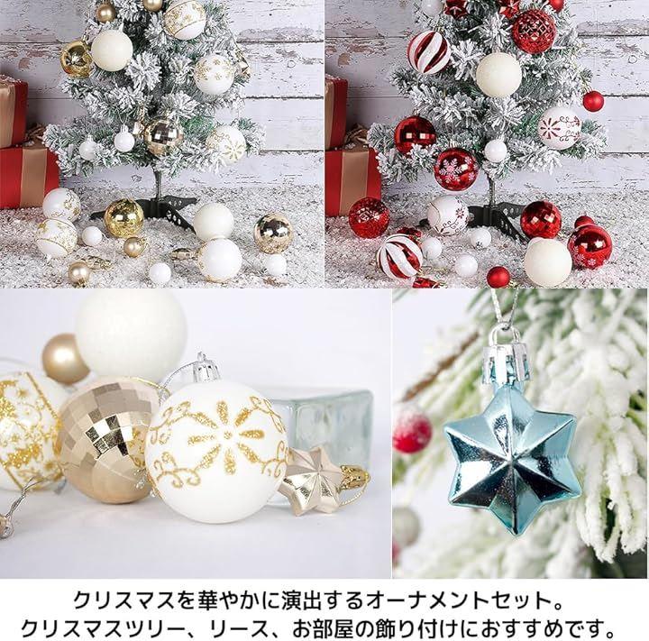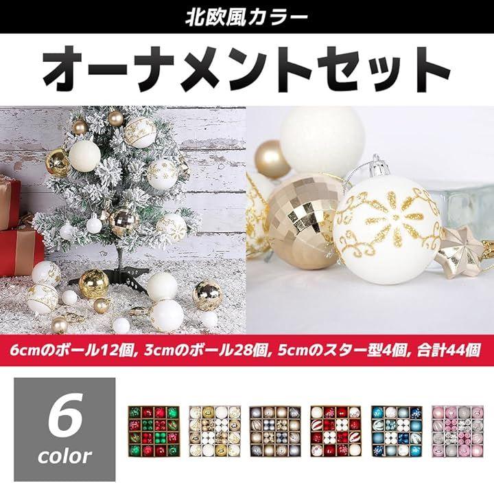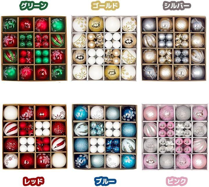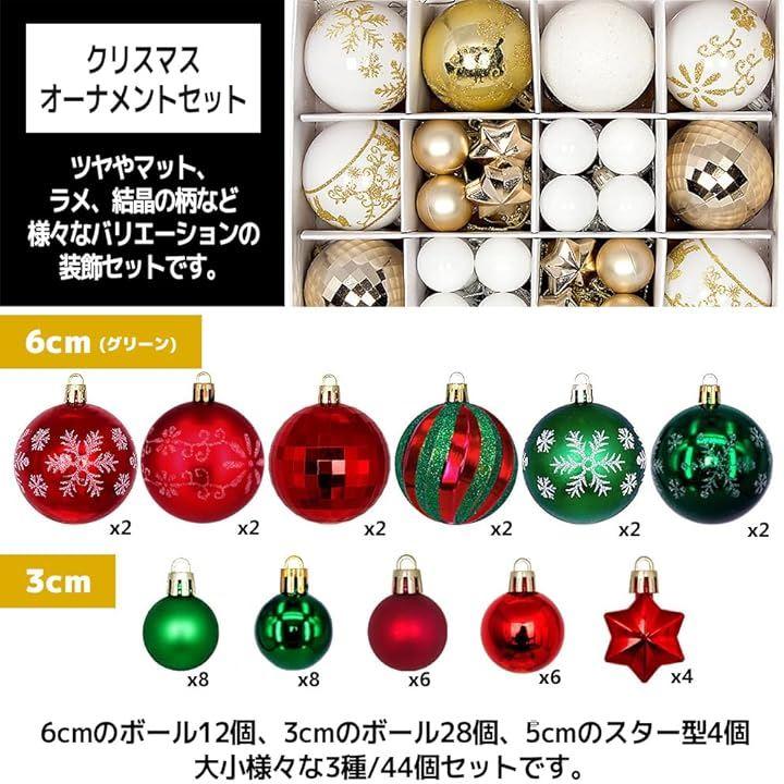「セット内容」6cmのボール12個、3cmのボール28個、5cmのスター型4個、合計44個「カラー」グリーン、ゴールド、シルバー、レッド、ブルー、ピンク「素材」プラスチック「重量」270g
