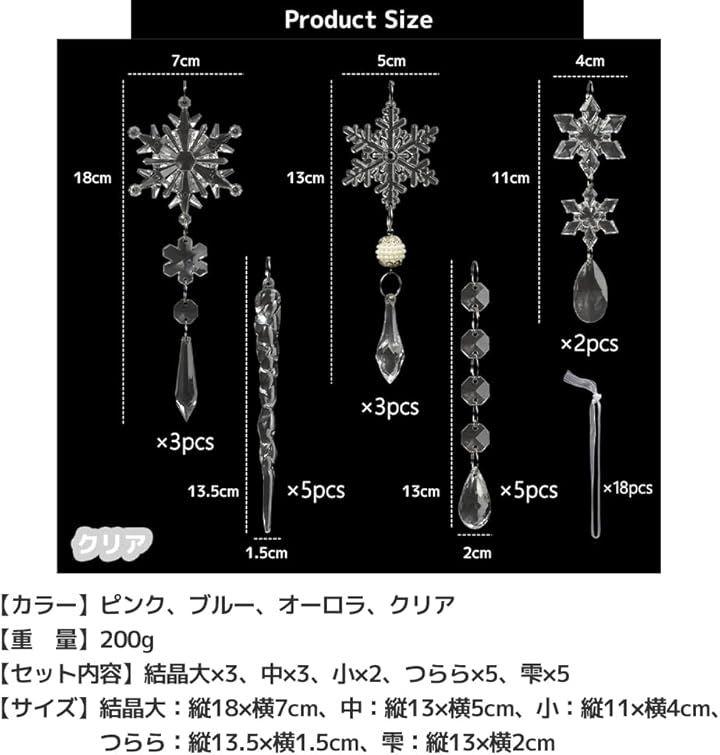 「セット内容」結晶大x3、中x3、小x2、つららx5、雫x5「サイズ」結晶大:縦18x横7cm、中:縦13x横5cm、小:縦11x横4cm、つらら:縦13.5x横1.5cm、雫:縦13x横2cm