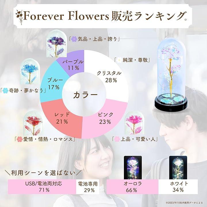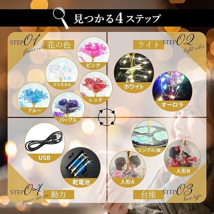 バラの色は(赤・青・紫・ピンク・ホワイト・クリスタル)と各種取り揃えており、花言葉や利用シーンに合わせてのプレゼントにも対応しています。