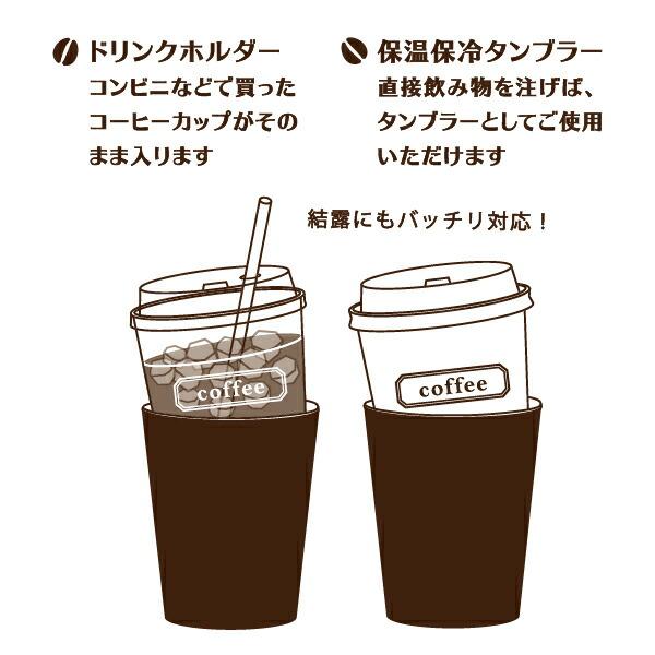 直接飲み物をそそいで保冷保温タンブラーとして、コンビニやコーヒーショップのカップをそのまま入れてドリンクホルダーとして、2wayで活躍できる優れもの!しっかり保冷保温してくれる&結露も防いでくれるので年中使用できます。【保温効力:46度以上(1時間) 保冷効力:7度以下(1時間)】