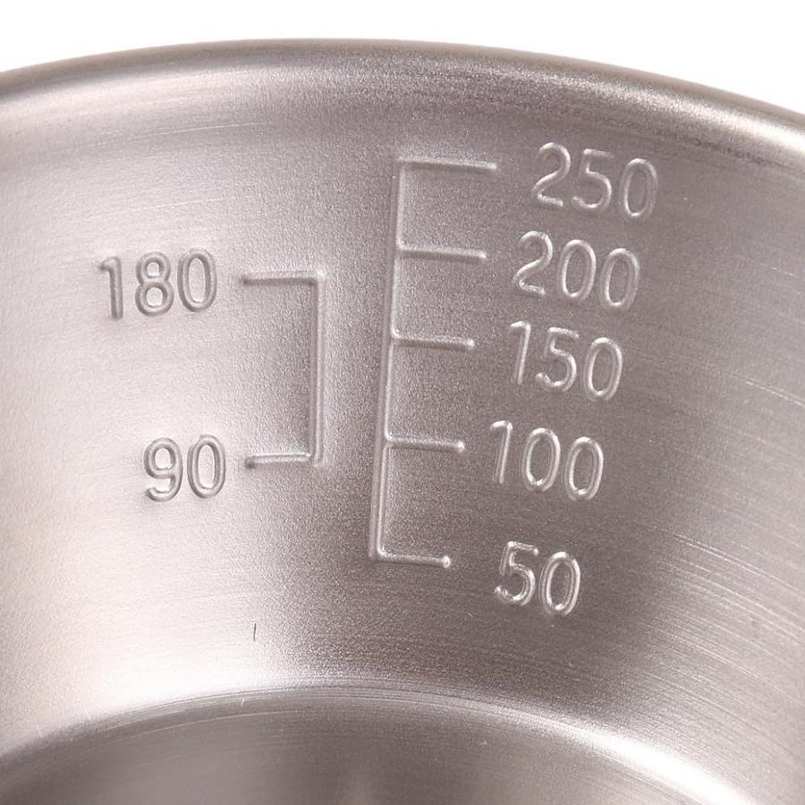 サイズ : 直径12 (底7.5) ×深さ4.5cm容量 : 320ml・重量 : 100g素材 : ステンレス仕様 : 調理に便利な目盛付き、50~250ml (50mlごとの目盛) /90、180ml、ブービーフェイス/ブービーロゴの2デザイン展開原産国 : 日本