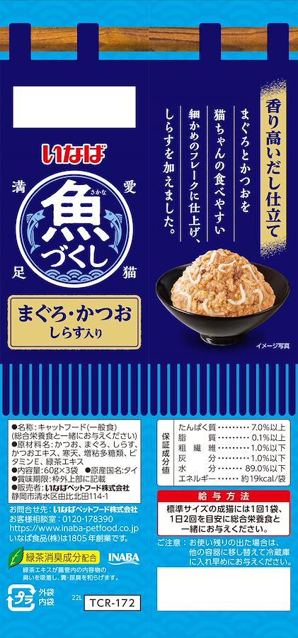 【原材料】 かつお、まぐろ、しらす、かつおエキス、寒天、増粘多糖類、ビタミンE、緑茶エキス 【保証成分】 たんぱく質7.0%以上 脂質0.1%以上 粗繊維1.0%以下 灰分1.0%以下 水分89.0%以下 【エネルギー】 約19kcal/袋