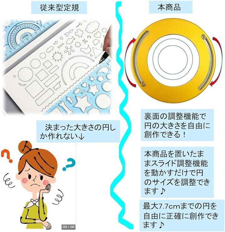・裏面の調整スライダーで簡単に円の直径を調節。最大7.7cmの円を自由に正確に描くことができます。
