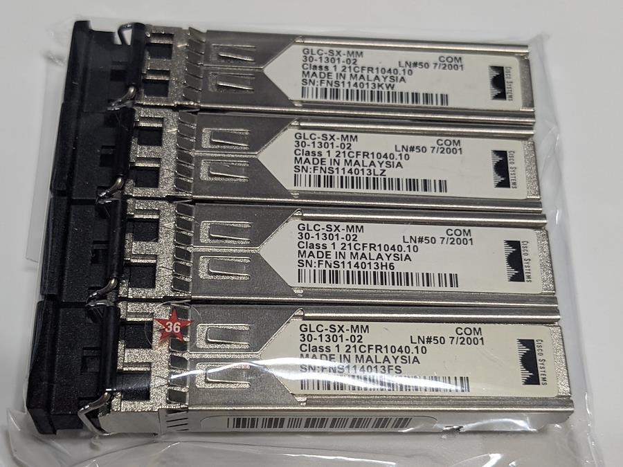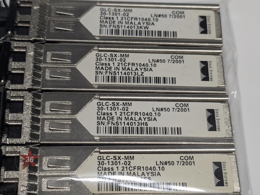 Cisco GLC-SX-MM SFPトランシーバー 30-1301-02 1Gb マルチモード LC 4個セット商品説明(ZenPlus用)Cisco製 SFPトランシーバーモジュール GLC-SX-MM の4個セットです。ギガビットイーサネット対応のマルチモードファイバー用光トランシーバーで、Ciscoネットワーク機器で広く使用されているモデルです。商品詳細メーカー:Cisco Systems型番:GLC-SX-MMPart Number:30-1301-02通信速度:1Gbps対応ファイバー:マルチモードファイバー(MMF)コネクタ:LC製造国:マレーシア数量4個セット状態中古品です。保管や使用に伴う細かなキズやスレがある場合があります。詳細は写真をご確認ください。付属品写真に写っているものがすべてです。注意事項対応機種・互換性については事前にご確認のうえご購入ください。