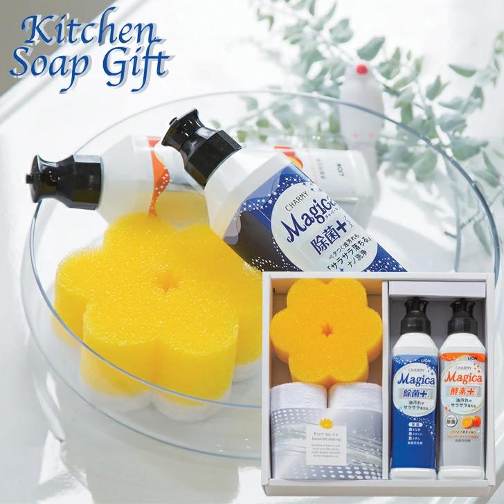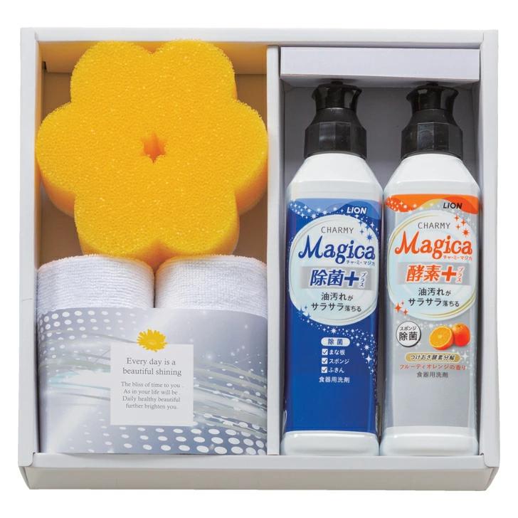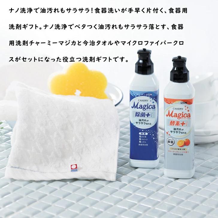 ナノ洗浄で油汚れもサラサラ! 食器洗いが手早く片づく、食器用洗剤ギフト! ナノ洗浄でベタつく油汚れもサラサラ落とす食器用洗剤、チャーミーマジカやマイクロファイバークロスがセットになった役立つキッチン洗剤ギフトです。