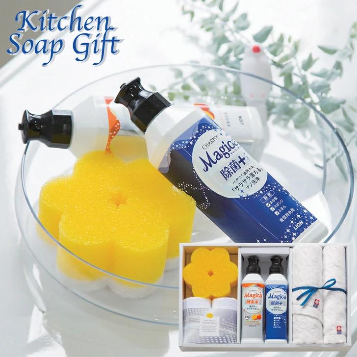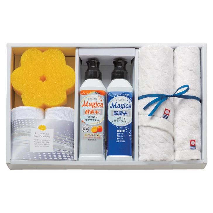 ナノ洗浄で油汚れもサラサラ!食器洗いが手早く片づく、食器用洗剤ギフト!ナノ洗浄でベタつく油汚れもサラサラ落とす食器用洗剤、チャーミーマジカと今治タオルやマイクロファイバークロスがセットになった役立つキッチン洗剤ギフトです。※マイクロファイバークロス、洗剤、スポンジは今治タオルブランド商品ではありません。