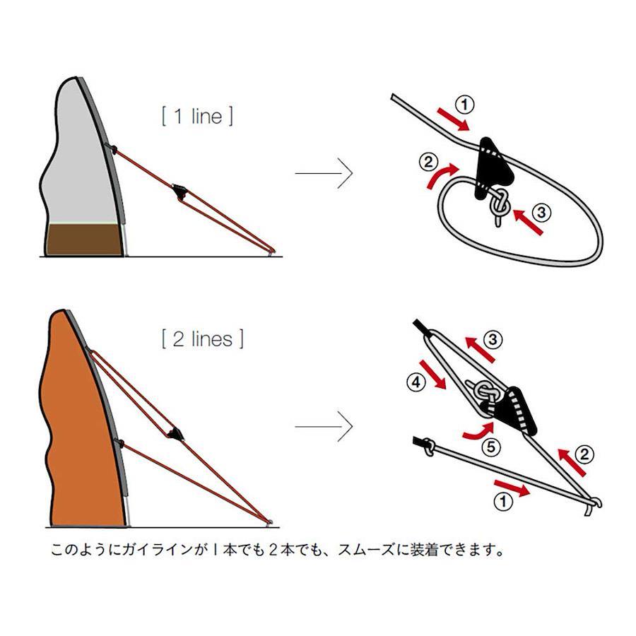 内側の溝でロープをロックして、テントやタープのガイラインにテンションをかけるアイテムです。-20℃まで対応し、グローブをしたままでも扱えます。