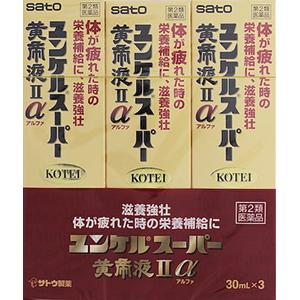 ■商品概要メーカー:佐藤製薬商品名:ユンケルスーパー黄帝液IIα 30mL×3本医薬品分類:第2類医薬品区分:OTC医薬品小児用区分:大人用(大人(15歳以上)の用量・用法しかない)薬剤形状:ドリンク・液剤内容量:30mL×3本商品概要:ビタミン含有保健薬【使用期限】出荷時点で使用期限終了まで1年以上JANコード:4987316029849商品コード:126001743■初回添付文書作成年月および改訂年月、添付文書版番号初回作成:2015/05改訂:―1ご使用に際して、この説明文書を必ずお読みください。また、必要な時読めるよう大切に保管してください。■特徴ユンケルスーパー黄帝液IIαは、人参、冬虫夏草、反鼻、シベットなどの生薬に各種ビタミンを配合したドリンクです。滋養強壮、肉体疲労時やかぜなどの発熱性消耗性疾患時の栄養補給にすぐれた効果をあらわします。■相談すること1.服用後、次の症状があらわれた場合は副作用の可能性がありますので、直ちに服用を中止し、この文書を持って医師、薬剤師又は登録販売者にご相談ください〔関係部位〕 〔症 状〕皮 膚 : 発疹・発赤、かゆみ2.しばらく服用しても症状がよくならない場合は服用を中止し、この文書を持って医師、薬剤師又は登録販売者にご相談ください■効能・効果○滋養強壮○肉体疲労・病中病後・発熱性消耗性疾患・食欲不振・栄養障害・妊娠授乳期などの場合の栄養補給○虚弱体質■用法・用量〔 年 齢 〕 成人〔1回服用量 〕 1本(30mL)〔1日服用回数〕 1回〔 年 齢 〕 15才未満〔1回服用量 〕 服用しないでください〔1日服用回数〕 服用しないでください<用法・用量に関連する注意>定められた用法・用量を厳守してください。■成分・分量1本(30mL)中〔成 分〕 ローヤルゼリー〔分 量〕 100mg〔働 き〕 ミツバチの咽頭腺でつくられる乳状物で、滋養強壮に効果をあらわします。〔成 分〕 西洋サンザシ乾燥エキス〔分 量〕 40mg〔働 き〕 西洋サンザシの花それぞれの生薬から抽出されたもので、滋養強壮、肉体疲労・発熱性消耗性疾患時の栄養補給に効果があります。〔成 分〕 地黄乾燥エキス〔分 量〕 60mg〔働 き〕 アカヤジオウの根それぞれの生薬から抽出されたもので、滋養強壮、肉体疲労・発熱性消耗性疾患時の栄養補給に効果があります。〔成 分〕 人参エキス〔分 量〕 55mg〔働 き〕 オタネニンジンの根それぞれの生薬から抽出されたもので、滋養強壮、肉体疲労・発熱性消耗性疾患時の栄養補給に効果があります。〔成 分〕 地骨皮流エキス〔分 量〕 0.1mL〔働 き〕 クコの根皮それぞれの生薬から抽出されたもので、滋養強壮、肉体疲労・発熱性消耗性疾患時の栄養補給に効果があります。〔成 分〕 反鼻チンキ〔分 量〕 100mg〔働 き〕 マムシの皮と内臓を除いて乾燥させたものそれぞれの生薬から抽出されたもので、滋養強壮、肉体疲労・発熱性消耗性疾患時の栄養補給に効果があります。〔成 分〕 シベットチンキ〔分 量〕 250mg〔働 き〕 ジャコウネコの腺分泌物それぞれの生薬から抽出されたもので、滋養強壮、肉体疲労・発熱性消耗性疾患時の栄養補給に効果があります。〔成 分〕 黄精流エキス〔分 量〕 300mg〔働 き〕 ナルコユリの根茎それぞれの生薬から抽出されたもので、滋養強壮、肉体疲労・発熱性消耗性疾患時の栄養補給に効果があります。〔成 分〕 冬虫夏草チンキ〔分 量〕 1mL〔働 き〕 フユムシナツクサタケが産生する子実体及び寄主である昆虫の幼虫を乾燥させたものそれぞれの生薬から抽出されたもので、滋養強壮、肉体疲労・発熱性消耗性疾患時の栄養補給に効果があります。〔成 分〕 ビタミンB2リン酸エステル〔分 量〕 5mg〔働 き〕 身体の働きに欠かせないビタミン類で、滋養強壮、肉体疲労・発熱性消耗性疾患時の栄養補給に効果をあらわします。〔成 分〕 ビタミンB6〔分 量〕 10mg〔働 き〕 身体の働きに欠かせないビタミン類で、滋養強壮、肉体疲労・発熱性消耗性疾患時の栄養補給に効果をあらわします。〔成 分〕 ニコチン酸アミド〔分 量〕 25mg〔働 き〕 身体の働きに欠かせないビタミン類で、滋養強壮、肉体疲労・発熱性消耗性疾患時の栄養補給に効果をあらわします。〔成 分〕 ビタミンB12〔分 量〕 2μg〔働 き〕 身体の働きに欠かせないビタミン類で、滋養強壮、肉体疲労・発熱性消耗性疾患時の栄養補給に効果をあらわします。〔成 分〕 ビタミンE酢酸エステル〔分 量〕 10mg〔働 き〕 身体の働きに欠かせないビタミン類で、滋養強壮、肉体疲労・発熱性消耗性疾患時の栄養補給に効果をあらわします。〔成 分〕 コンドロイチン硫酸エステルナトリウム〔分 量〕 120mg〔働 き〕 滋養強壮に効果をあらわします。〔成 分〕 無水カフェイン〔分 量〕 50mg〔働 き〕 滋養強壮に効果をあらわします。〔成 分〕 ガンマ-オリザノール〔分 量〕 10mg〔働 き〕 滋養強壮に効果をあらわします。添加物として、白糖、dl-リンゴ酸、安息香酸Na、パラベン、ポリオキシエチレン硬化ヒマシ油、カラメル、香料、pH調節剤、アルコール(0.9mL以下)を含有します。<