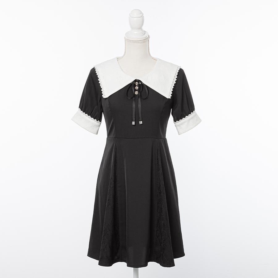 アフタヌーンティーにおすすめ♪上品可愛いワンピースのご紹介。【デザイン】レース切替と大きな角襟が上品な、王道クラシカルガーリーなワンピースです。襟やカフス・スカートのパネル切替えなど、あらゆるところにレースを重ねて上品な雰囲気をプラスしつつ、立体感たっぷりなディテールになっています。付属のグログランテープはご自身で結んでいただく仕様で、取り外し可能です。先端にはシルバーの金具がついており高見えします。前中心とカフスにバラモチーフのシルバーボタンがあしらわれており、ロマンティックな印象に◎後ろファスナーを開閉して着脱する仕様です。1枚で存在感たっぷりなデザインワンピースなので、夏~秋口にかけてピッタリな1枚です!