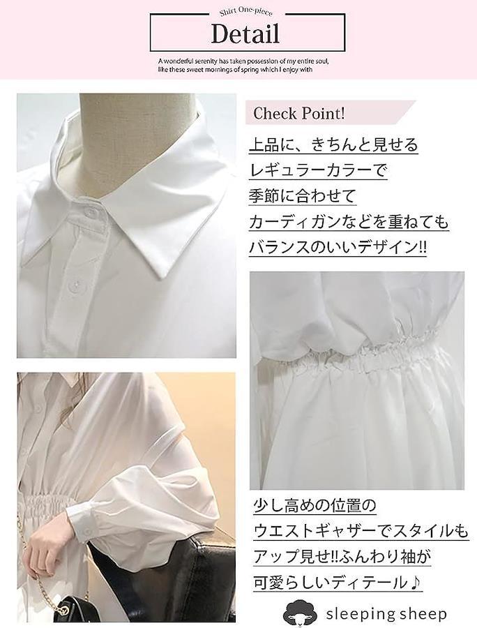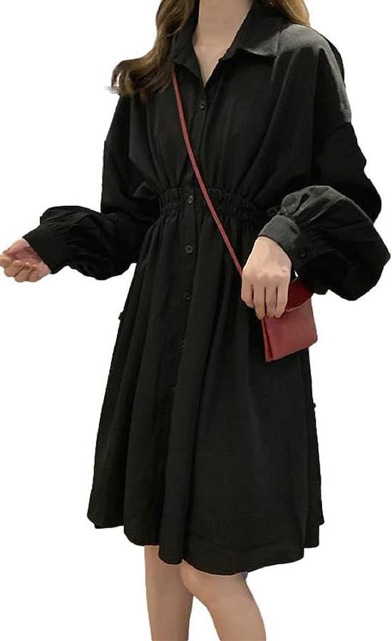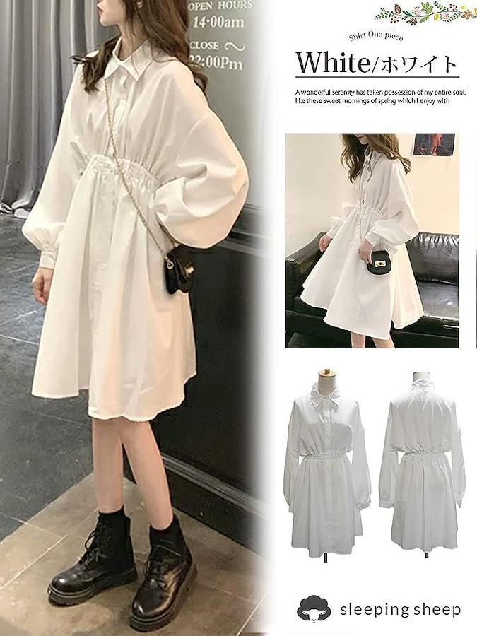 Classy girly waist gathered shirt dress long sleeves A-line ladies white black knee length voluminous sleeves waist mark flared tunic