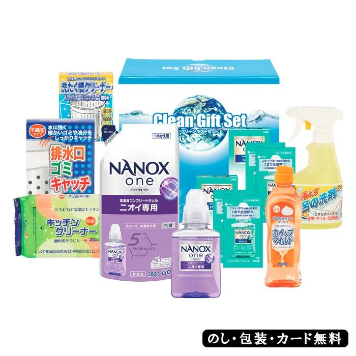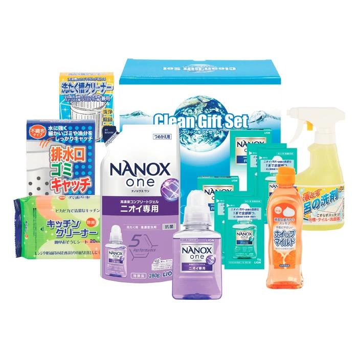 ライオントップナノックス380g、詰替280g、ホイップマイルド(台所洗剤)250ml、お風呂の洗剤スプレー300ml、キッチンクリーナー(20枚入)、洗たく槽クリーナー、排水口ゴミキャッチ(8P)×各1、ライオントップナノックス(10g×2包)×2