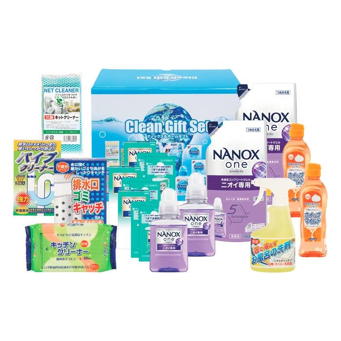 ライオントップナノックス380g、詰替280g、台所洗剤250ml×各2、ライオントップナノックス(10g×2)×3、お風呂の洗剤スプレー300ml、キッチンクリーナー20P、排水口ゴミキャッチ8P、パイプクリーナー(3P)、抗菌ネットクリーナー×各1