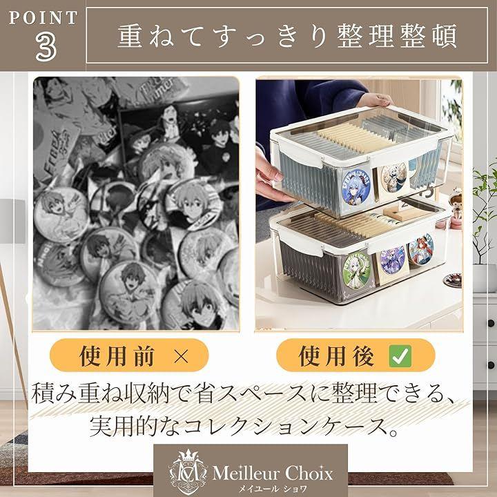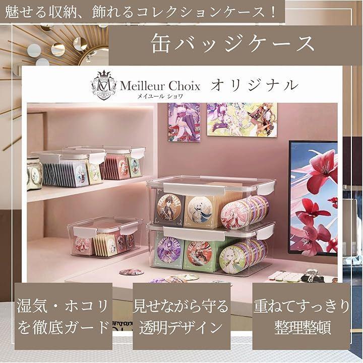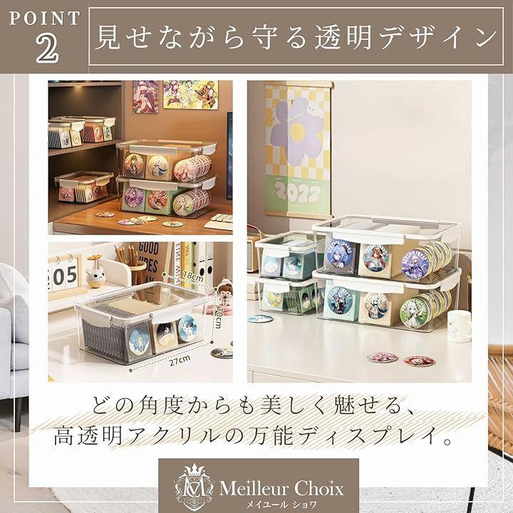 「見せながら守る透明デザイン」 高透明度のアクリル素材で、缶バッジやカードのデザインを鮮明に鑑賞可能。