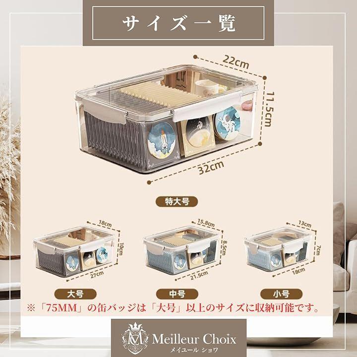 *小:幅18cmx奥行13cmx高さ7cm *中:幅21.5cmx奥行15.8cmx高さ8.5cm *大:幅27cmx奥行18cmx高さ10cm(75cm缶バッジ対応)