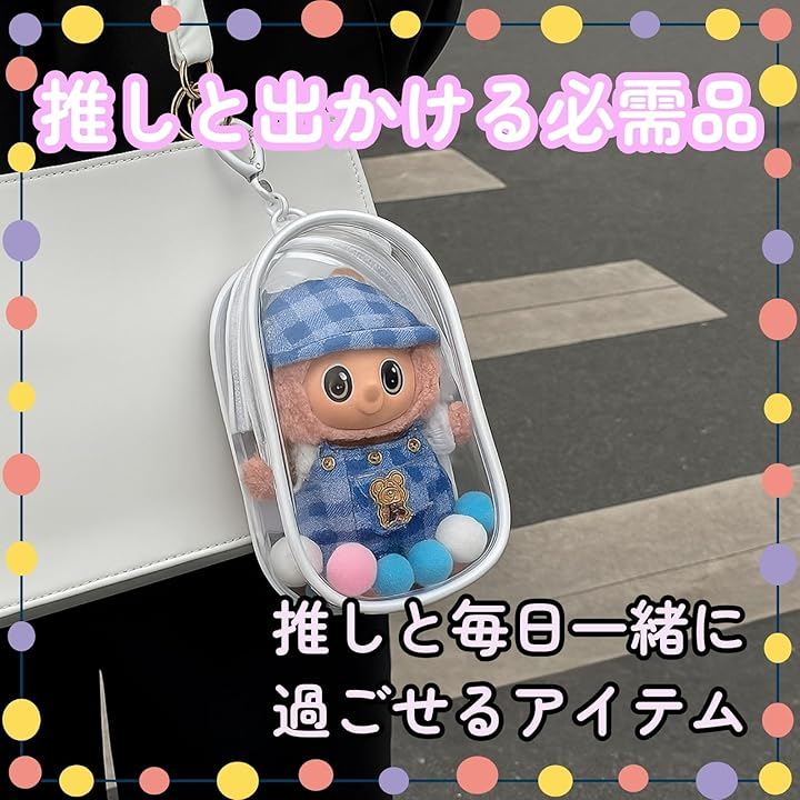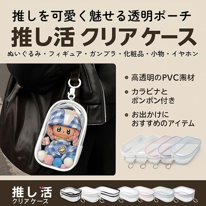 「360°クリアデザインで推しを魅せる」 本ポーチは前面も背面も透明PVC素材を使用しており、大切なぬいぐるみやフィギュアをあらゆる角度から綺麗に見せることができます。