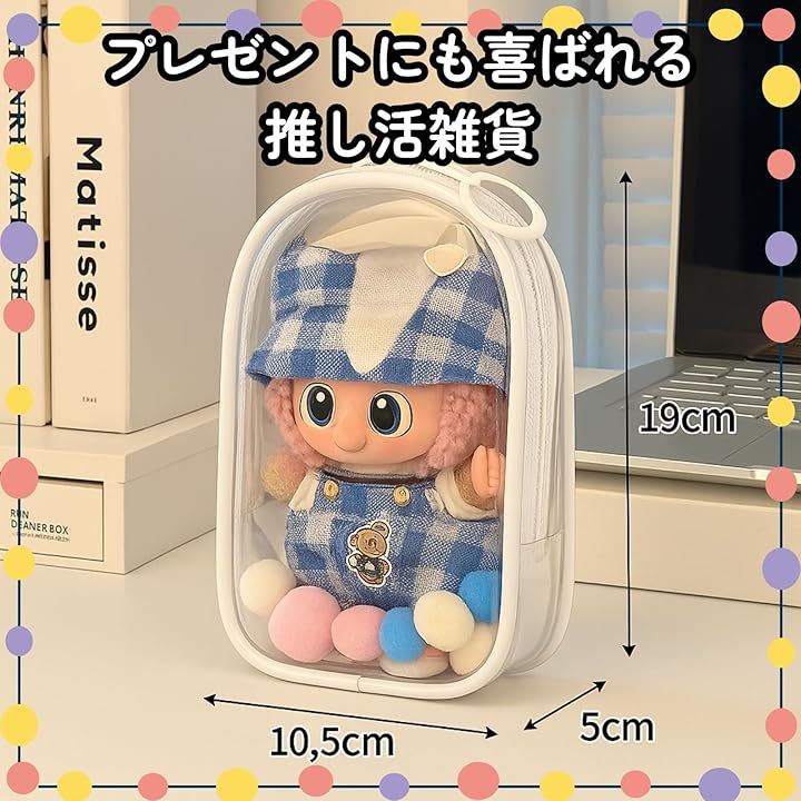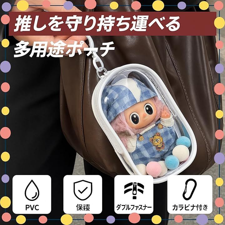 「360°クリアデザインで推しを魅せる」 本ポーチは前面も背面も透明PVC素材を使用しており、大切なぬいぐるみやフィギュアをあらゆる角度から綺麗に見せることができます。