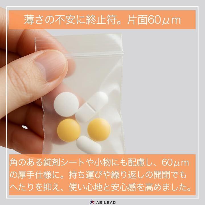 ABILEADのチャック付き小分け袋は、外寸が横4cm 縦6cmのミニサイズで、片面60マイクロメートルの厚手フィルムを採用しています。