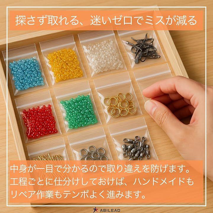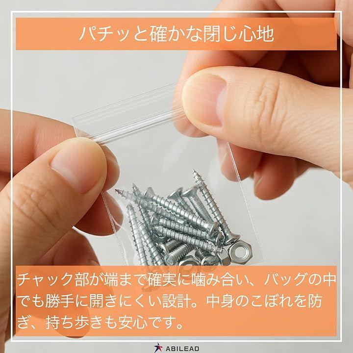 ABILEADのチャック付き小分け袋は、外寸が横4cm 縦6cmのミニサイズで、片面60マイクロメートルの厚手フィルムを採用しています。