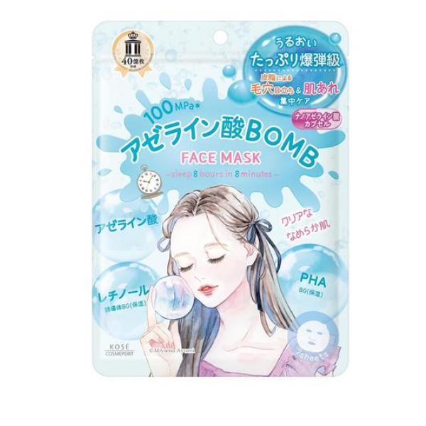 製品の特徴●コーセーコスメポート CLEAR TURN クリアターン アゼライン酸BOMBマスク(ボムマスク)●フェイスマスク●うるおいたっぷり爆弾級(★)。肌あれ・毛穴目立ちを集中ケアします。水分・油分のバランスをととのえ、なめらか肌へみちびきます。また、ナノサイズのアゼライン酸カプセルを配合、100MPa(*)の高圧処理技術で乳化粒子をナノサイズ化したことで、美容液が角層までぐんぐん浸透します。◇肌あれ・毛穴ケア:アゼライン酸・PHA(※1)・グリシルグリシン(※2)・BG(保湿)◇水分・油分バランスケア:レチノール誘導体(※3)・浸透型(※4)ヒアルロン酸(※5)・BG(保湿)●無着色・無鉱物油・アルコールフリー(エチルアルコール)・パラベンフリー・紫外線吸収剤フリー・シリコーンフリーのやさしい使い心地です。●天然香料配合で心地よい眠りにみちびくようなリラックスハーバルの香りです。●シートの表面が凸凹しているプレミアムなベンリーゼ(※6)使用。やわらかな肌あたりで、保水性や密着性が優れています。●人気イラストレーターミヤマアユミさんコラボデザイン。●販売名:CT BS うるおいマスク AZ
