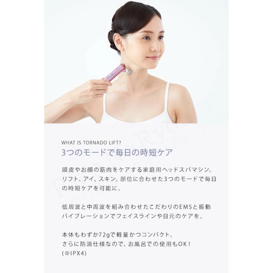 本体には3つのモード(Lift/Eye/Skin)を搭載し、フェイスライン、目元、肌全体など、部位に合わせた使い分けが可能です。トルネード形状のローラーが肌にフィットしやすく、ローリングによる心地よい刺激とEMSの組み合わせで、毎日のケア時間を快適にサポートします。