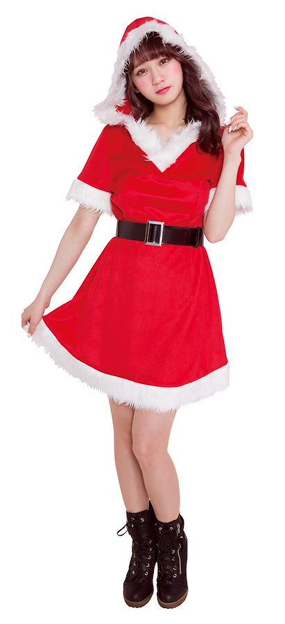 ふわふわのファー付きフードと、Vネックの襟元が可愛いサンタコスチューム。シンプルなデザインで着やすい。ベルト付きでスタイルアップできます。