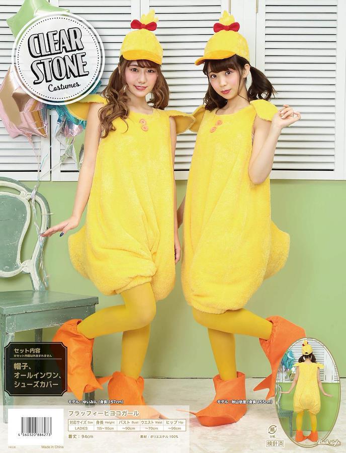 もこもこ生地を使用したあたたかいヒヨココスチューム。綿をたっぷり入れて、可愛いヒヨコのおしりを再現しました! 着やすいデザインなので、グループコスにもおすすめです。 セット内容:帽子、オールインワン、シューズカバー 素材:ポリエステル100% 洗濯表示:洗濯不可、塩素系漂白剤による漂白不可、アイロン不可、ドライクリーニング不可 総重量(g):630g 対応:レディース/身長 155~165cm、B ~90cm、W ~70cm、H ~96cm メイン部分の長さ(着丈等) (cm):94cm モデル身長(cm):秋山依里155cm、ゆいみん157cm、 原産国:中国