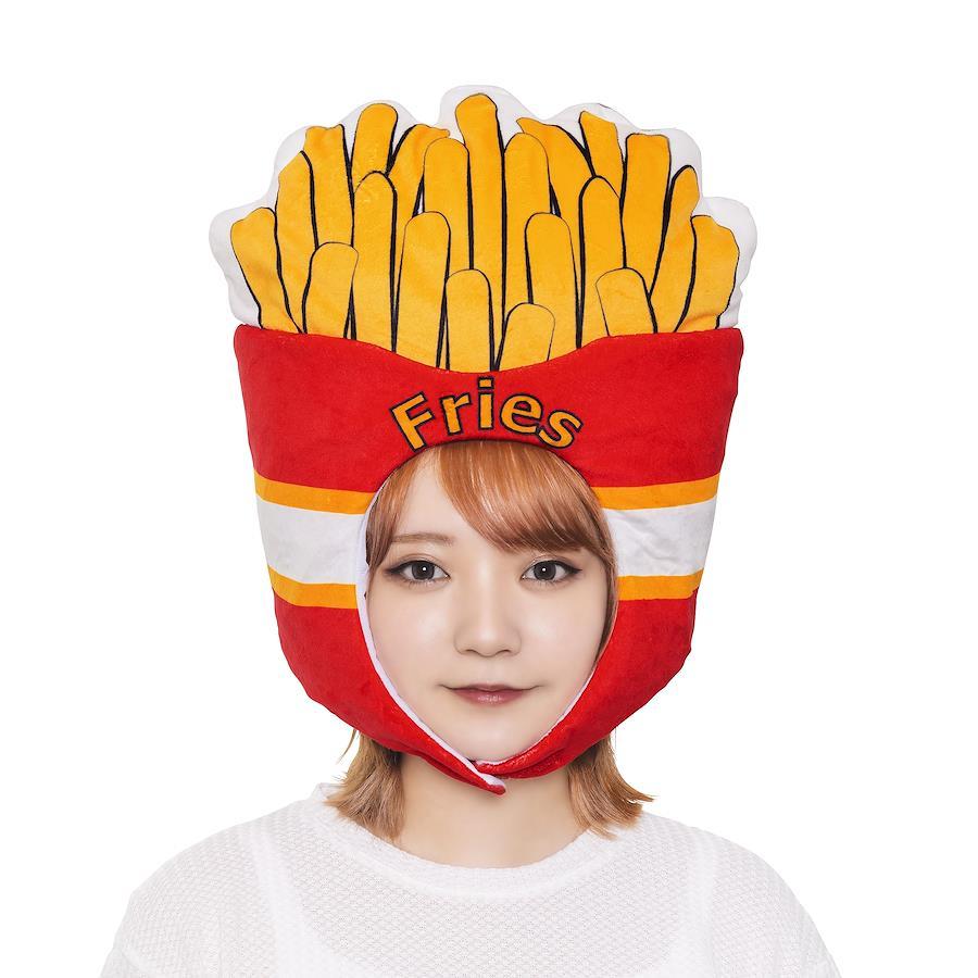 目立つこと間違いなし。みんな大好きフライドポテトのかぶりもの。ケースとポテトの間は段差があり立体感のある仕様。こだわりのあるオリジナルデザイン。首元の面ファスナーで調整可能。大人向け男女兼用。宴会、余興、イベント、ハロウィン、仮装マラソンなど様々なシーンで活躍します。