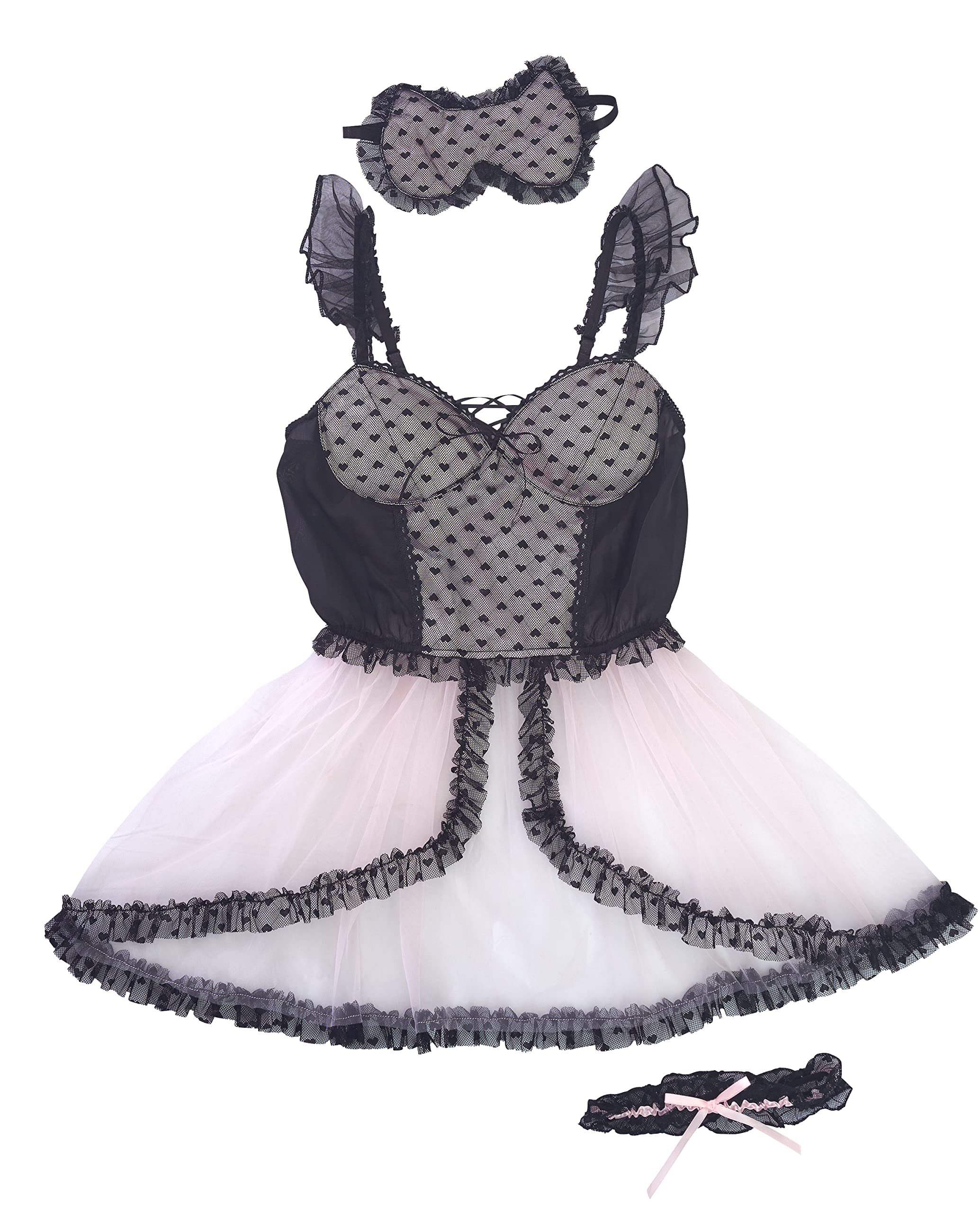 アイマスクとベビードールがセットになった「poppy doll(ポピードール)」シリーズ。白いポピーの花言葉は「眠り」。ねこ耳型のアイマスクと、ブラックのハート柄チュール生地とベビーピンクの組み合わせが女の子の気持ちをアップ。撮影する時、お泊りでお喋りする時には、ヘッドドレスみたいに付けるのもオススメです。肩紐調節有り。背中はシャーリングゴム仕様。【推奨サイズ】Ladies:身長155~165cm、B/~90cm、W/~70cm、H/~96cm【注意事項】※生産時期やロット、デザインによって、多少サイズ・色・柄が異なる場合があります。摩擦や水濡れにより色移りする恐れがありますのでご注意ください。※商品画像は可能な限り実物の色に近づくよう調整しておりますが、お使いのモニター設定、お部屋の照明等により実際の商品と色味が異なって見える場合がございます。又、同じ商品の画像でも、撮影環境によって画像の色に差異が生じる場合がございます。【洗濯表示】洗濯機不可、弱い手洗い可、塩素系漂白剤による漂白不可、アイロンは中温で当て布使用、ドライクリーニング不可 ※クリーニングはお避けください。色落ちの可能性がありますので、他のものとの洗濯はお避け下さい。アイロンは、当て布使用して下さい。【製造元】株式会社クリアストーン(#lf)(#lf)(#lf)商品購入前に、ストア紹介ページをご確認ください。