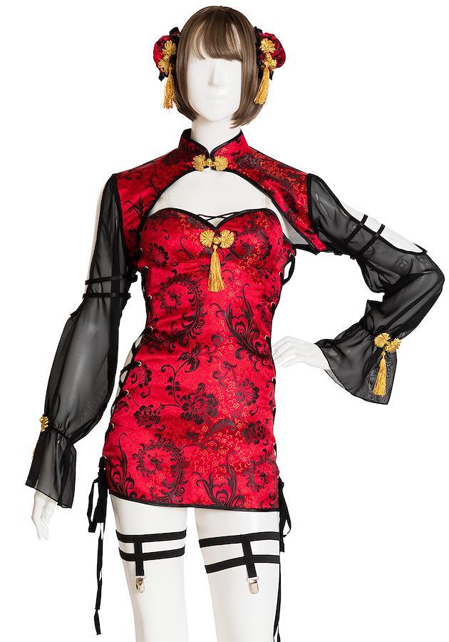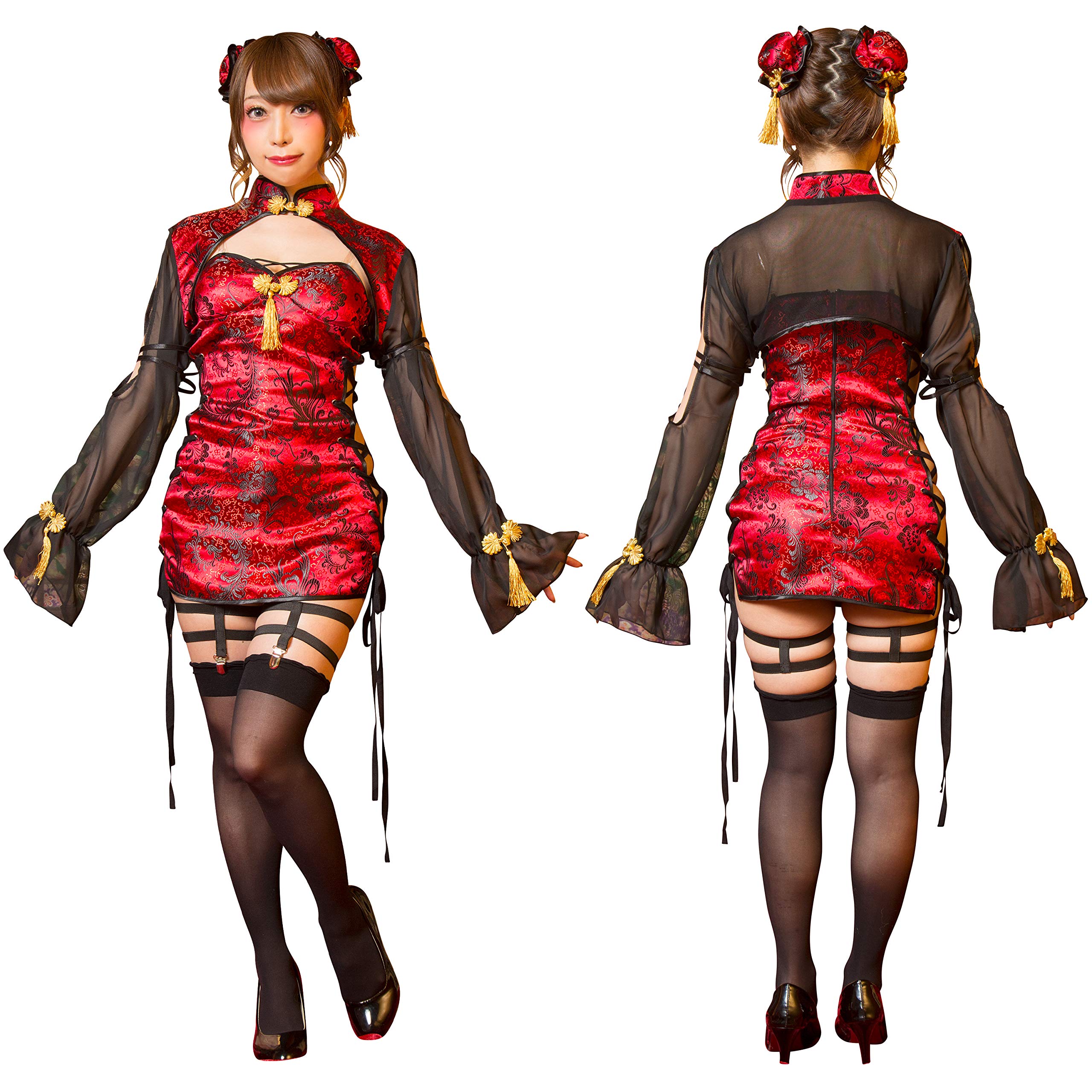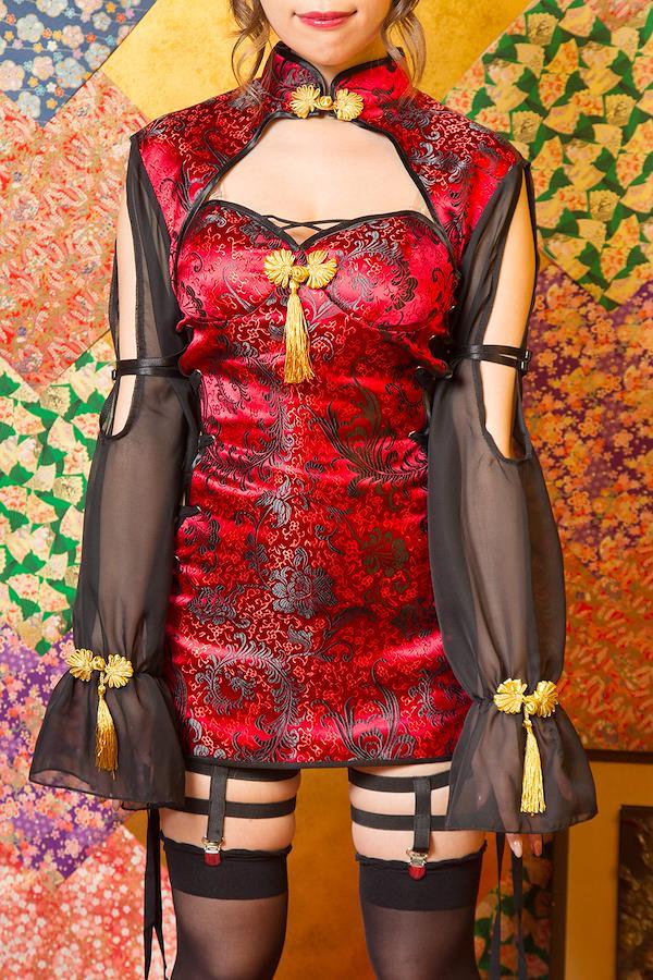 「かわいい×フェティッシュ」がコンセプトの「SugarWhip」シリーズ。撮影会にもおすすめです。ジャケットを脱いで2wayでも着用できる5点セット。深いボルドーのチャイナ生地をベースに、高級感のあるゴールドのチャイナボタンをポイントに使用。お団子カバーはウィッグにも装着しやすいヘアクリップ付き。ジャケットの袖のオープンショルダー部分には拘束されてるようなストラップ(アジャスター付き)が二本ついています。背中は透け感のあるメッシュ素材。ワンピースはサイドがレースアップで調整可能。ガーターはクリップ付きなのでお好みのソックスをコーディネートして。【推奨サイズ】Ladies:身長155~165cm、B/~90cm、W/~70cm、H/~96cm【注意事項】※生産時期やロット、デザインによって、多少サイズ・色・柄が異なる場合があります。摩擦や水濡れにより色移りする恐れがありますのでご注意ください。※商品画像は可能な限り実物の色に近づくよう調整しておりますが、お使いのモニター設定、お部屋の照明等により実際の商品と色味が異なって見える場合がございます。又、同じ商品の画像でも、撮影環境によって画像の色に差異が生じる場合がございます。【洗濯表示】洗濯不可、塩素系漂白剤による漂白不可、アイロンは中温で当て布使用、ドライクリーニング不可※洗濯はお避け下さい。汚れは水で薄めた中性洗剤でタオル等を使って拭き取って下さい。アイロンは、当て布使用して下さい。【製造元】株式会社クリアストーン(#lf)(#lf)(#lf)商品購入前に、ストア紹介ページをご確認ください。