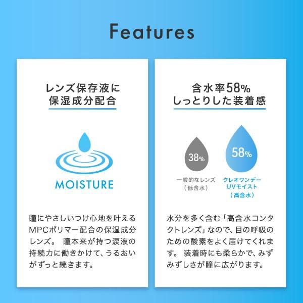コンタクトレンズは高度管理医療機器です。取り扱い方法を守り正しくご使用下さい。 含水率58%で瞳にフィットする高コスパのコンタクトレンズ。紫外線をカットする紫外線吸収剤配合で瞳の紫外線対策もできます。 形状記憶のレンズで、裏表もわかりやすく装着も簡単です。 ◆1日終日装用タイプ/1箱30枚入り/片眼1か月分 ◆医療機器承認番号:22800BZI00037A11 ◆ DIA(直径):14.2mm ◆ BC(ベースカーブ):8.7◆ 中心厚:0.08mm ◆ 含水率:58%