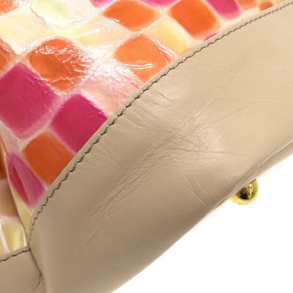 クレリアのハンドのご紹介です!クロコダイル調の型押しにパステル調の色使いと、つるっとしたエナメル調の光沢感がお洒落!開閉はマグネット式。本体の左右上部にスナップボタンあり。中はファスナーポケット1つ、ポケット2つあり。表の底部分には鋲が4つあり。☆状態は、本体の型崩れ、表面のスレ・シワ・小傷、底のシワ、持ち手のスレ・シワ・くせつき、中の薄汚れ・スレ・毛羽立ちが少々ある程度ですよ!デイリーユーズにオススメ!