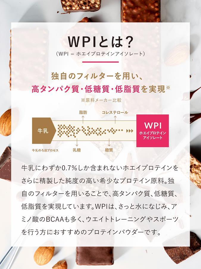 ??高純度WPI(ホエイプロテインアイソレート)配合。高プロテイン15g・低糖質*8.7gのプロテインバー。 * 低糖質とは食事摂取基準から算出した1食分の糖質量との比較です。 ??WPI 5gと大豆プロテインを配合 ??塩チョコレート味(キャラメルフレーバー使用) ??内容量:12本