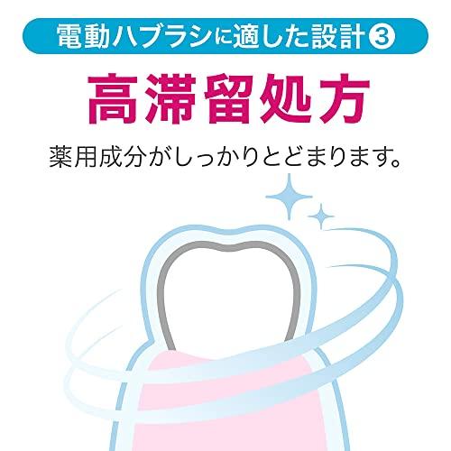 *2 6歳未満のお子様へのご使用はお控えください。 高濃度フッ素配合の独自処方ジェルが歯面をコーティング。フッ素でムシ歯を予防する電動ハブラシ向け *1 ハミガキ。 ●研磨剤無配合のため歯や歯ぐきをやさしく磨ける。 ●飛び散りにくくじっくりみがける低発泡タイプのジェルペースト。 ●高滞留処方で薬用成分が歯と歯ぐきにしっかりとどまる。 ●フッ素がエナメル質の修復(再石灰化)を促進。歯質を強化し、ムシ歯の発生と進行を防ぐ。 ●高濃度フッ素(1450ppm)配合。*2
