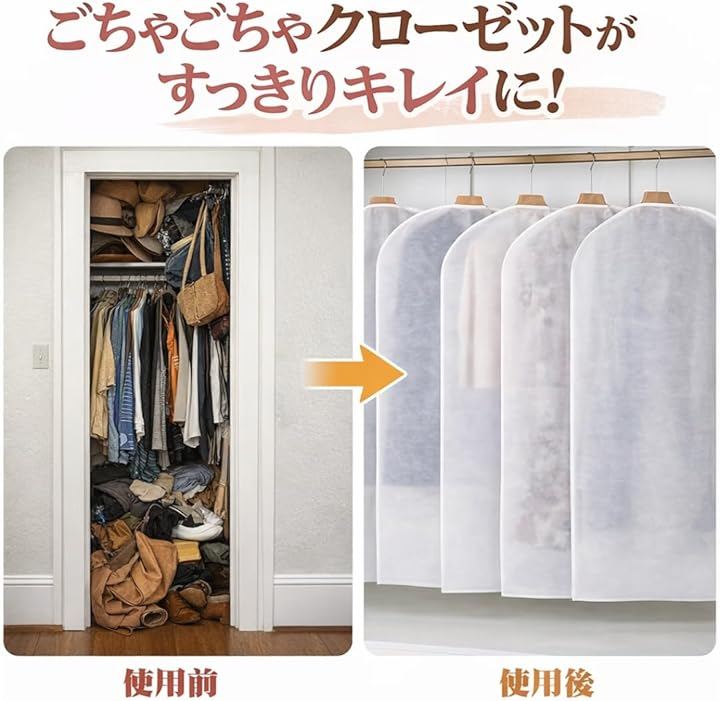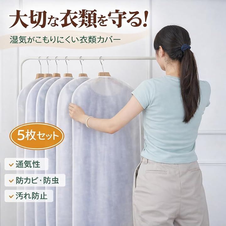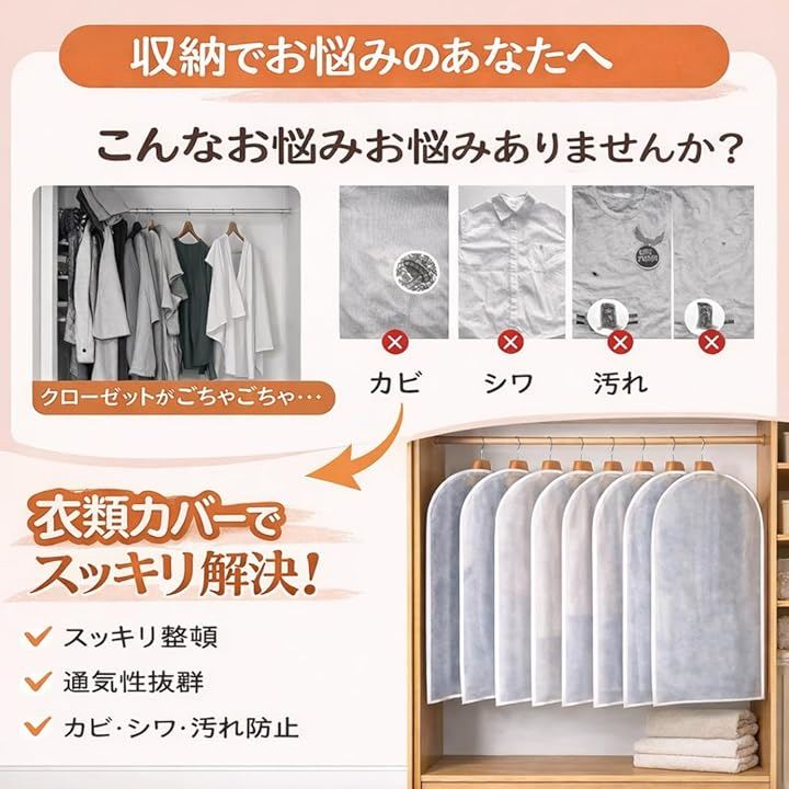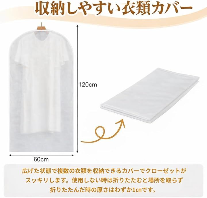 「大切な衣類をホコリ・湿気・カビ・虫からしっかり守る」スーツ・コート・ワンピース・Tシャツなど、幅広い衣類に対応できる60x120cmサイズで、クローゼット収納をすっきり清潔に保ちます。
