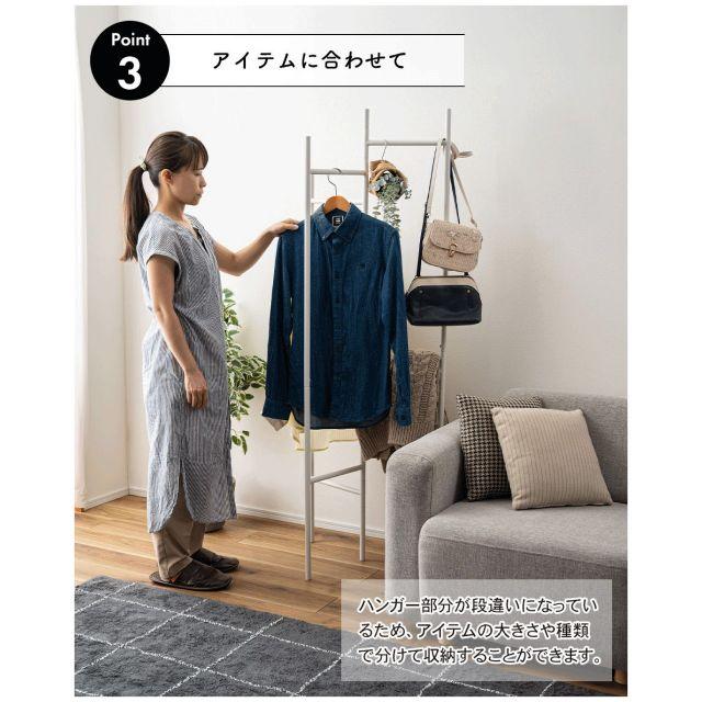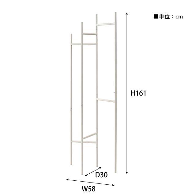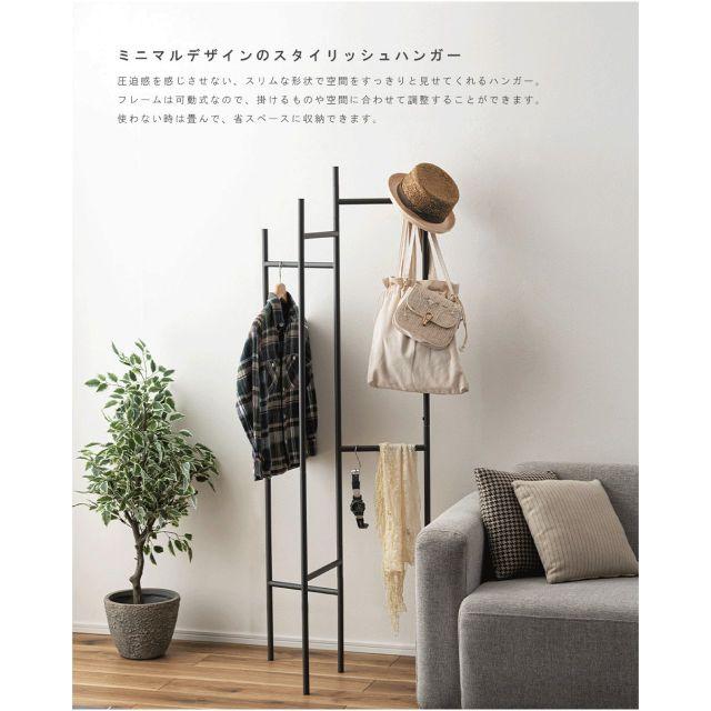 ●ミニマルデザインのスタイリッシュハンガー。●圧迫感を感じさせないスリムな形状で、すっきりと見せてくれるハンガー。●フレームは可動式なので、掛けるものや空間に合わせて調整することができます。●使わない時は畳んで省スペースに収納可能。●可動式のフレームは空間や使用アイテムに合わせてフレームの間隔を変えることができます。●使わない時は折り畳み可能。厚さ約6cmとコンパクトに。●壁際や家具の隙間に収納できます。●ハンガー部分が段違いになっているため、アイテムの大きさや種類に合わせて効率収納。●フレームは光沢を抑えたマットな質感。●様々なインテリアと相性が良く、空間を上品な印象に。〈製品規格〉商品サイズ:W58×D30×H161商品重量:4.0kg静的耐荷重:10kg材質:スチール(粉体塗装)組立:組立式原産地:中国