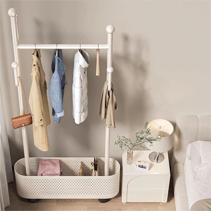 Clothes Rack, Coat Rack with Basket, Large Capacity, Casters, Four Hooks, Indoor Decor