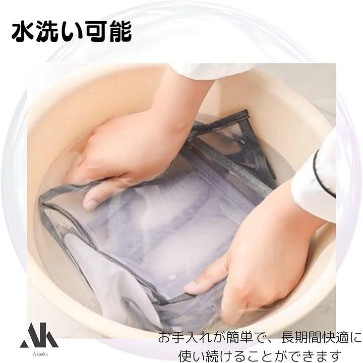 「メリット:通気性と清潔さを保つ機能」 「いつでも清潔に保てる。水洗い可能な便利さ」 収納ボックスは水洗いが可能です。
