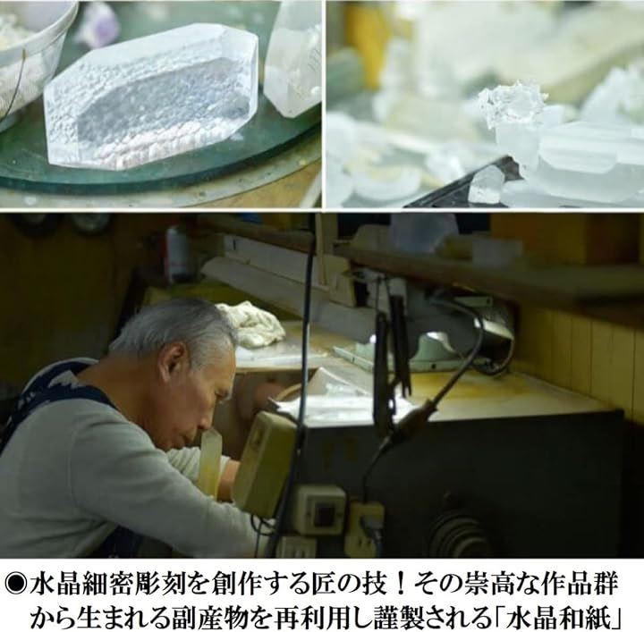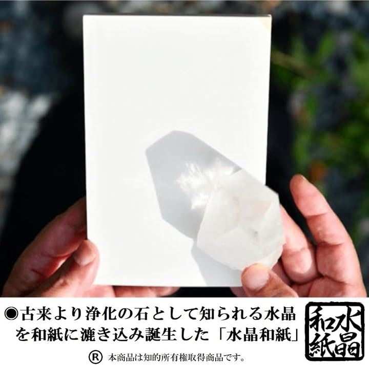 「スペック」知的所有権取得商品 素材:水晶和紙:手漉き和紙+水晶(水晶溶解水)・本水晶(半球10mm) /サイズ:縦12x横12cm 商品には微細な繊維質の色(黒や茶)が見られる場合がございますが、天然繊維の証ですので、汚れ(不良品)ではありませんので、ご了承下さい。