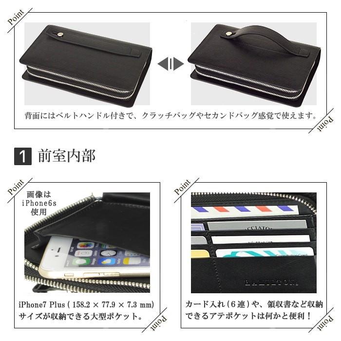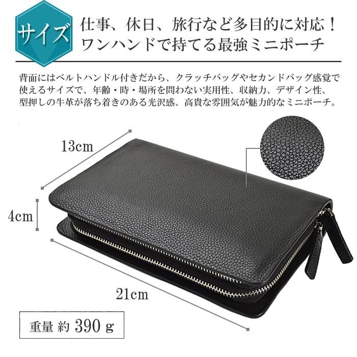 ◆収納を2室に分けた事で必要な物はすべて入るほどの大容量、機能性が備わったワンハンドで持てるミニポーチ。◆カードやレシート、領収書などの小物の仕分けも楽にでき、iPhone7 Plus(158.2×77.9×7.3(mm))が入る大型ポケットも便利!◆柔らかい牛革製だからカードの出し入れもしやすいので最初から使いやすいです。◆背面にはベルトハンドル付きだからクラッチバッグやセカンドバッグ感覚でお使いいただけます。◆年齢・時・場所を問わない実用性、収納力、デザイン性、型押しの牛革が落ち着きのある光沢感、高貴な雰囲気が魅力!
