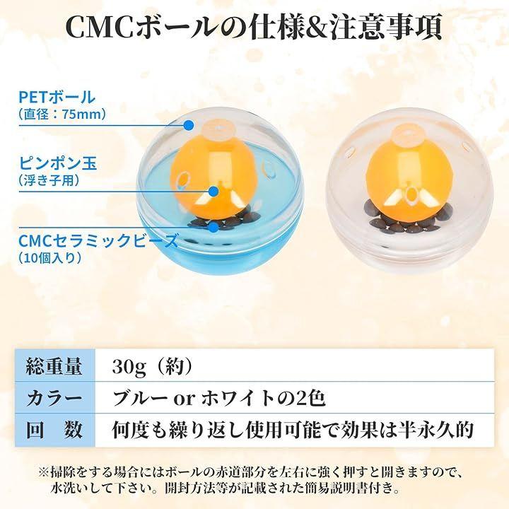「CMCボールの仕様&注意事項」ボールサイズ:直径75mm (約)*総重量:30g(約)*カラー:青色(ブルー ) 、白色(ホワイト) *CMC充填量:4mg/個x10個入り *何度も繰り返し使用可能で効果は半永久的。? *掃除をする場合にはボールの赤道部分を左右に強く押すと開きますので、水洗いして下さい。