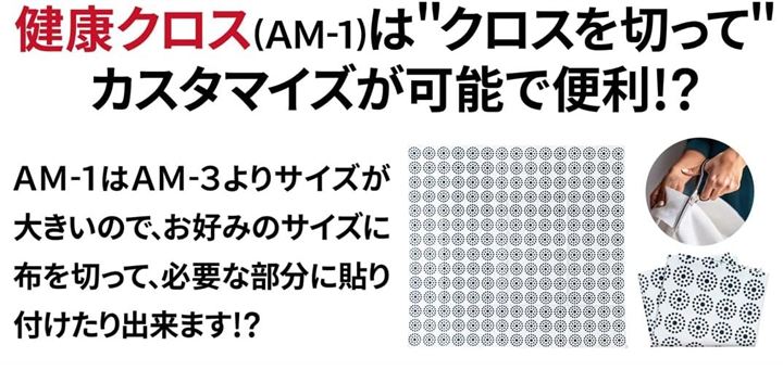 「CM健康クロスAM-1の仕様」*サイズ:50cmx45cm *CMC量約4.6g *生地:西洋綿 *AM-1はAM-3より大きいサイズなので、布を切って、帽子に生地を挟んだり、腹巻や下着に入れたり、と自分の好みの大きさに健康クロスをカスタマイズして使用可能です。