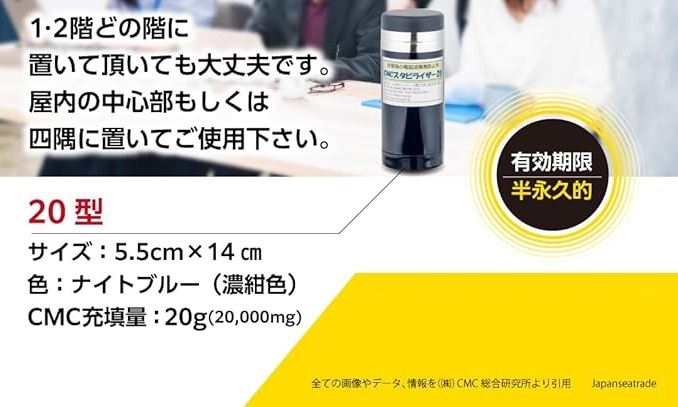「CMCスタビライザー20型の仕様」*CMC充填量:20,000mg(20g)、*本体:SUS(ステンレス)、カラー:ナイトブルー(濃紺色)*ラミネート加工, *サイズ:直径5.5cm、*高さ:14cm、*総重量:180g, **電気・ハイブリット車対応型 *有効期限=半永久的 *CMC商品はご自身の電磁波対策用としてはもちろん、ちょっとしたお礼や、心遣いのミニギフトにぴったりなアイテムですので、取引先様への贈り物としても、クリスマスやバレンタイン、ホワイトデー、バースデイ、誕生日、母の日、父の日、、贈り物、卒業式、入学式、結婚式、お祝い事、お盆、お正月、彼や彼女、お父さん、お母さん、おじいちゃん、おばあちゃんへのプレゼントとしてもおススメのできるアイテムです。