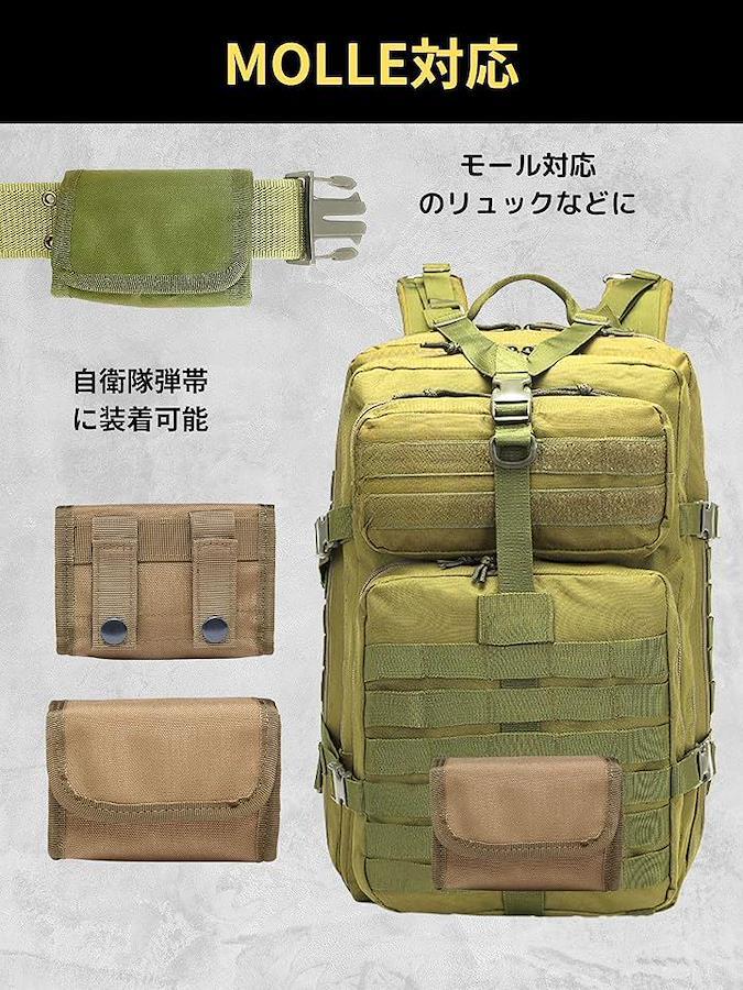 モール、MOLLE対応のためベルトやモール対応のリュックなどに装着可能です。