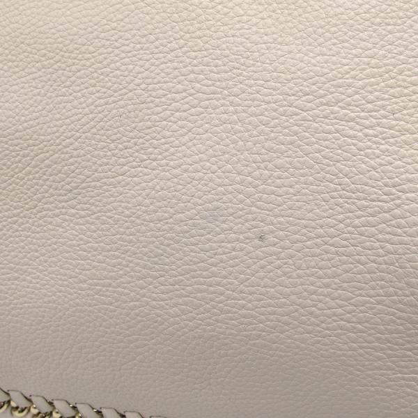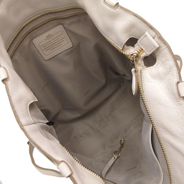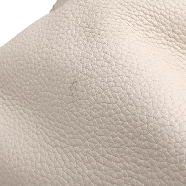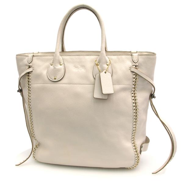 コーチのトートの入荷です!白系の色の型押しレザーが本体で、前後と底の継ぎ目に革紐とチェーンが組み込まれたデザイン。両サイドには二本の革紐をターンロックきーで重ねた飾りあり。開閉はファスナー式で、中はゴロが柄になった生地が裏地として使われていて、ファスナーポケット1つ、スナップボタン式ポケット1つ、革紐につながったフック1つあり。★状態は、本体の型崩れ、表面のスレ・薄汚れ・黄ばみ・色焼け、角や縁のスレ・黒ずみ、底のスレ、持ち手のスレ・黒ずみ、中の薄汚れ・スナップボタンのレザー部分のスレ・黒ずみ等、使用感ありですが、普段使いには問題なし!少々重量あり。清潔感と高級感のあるデザインですよ!