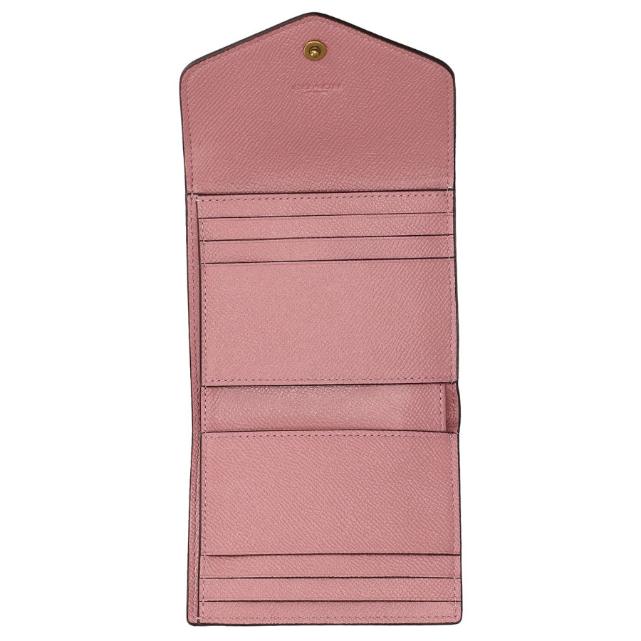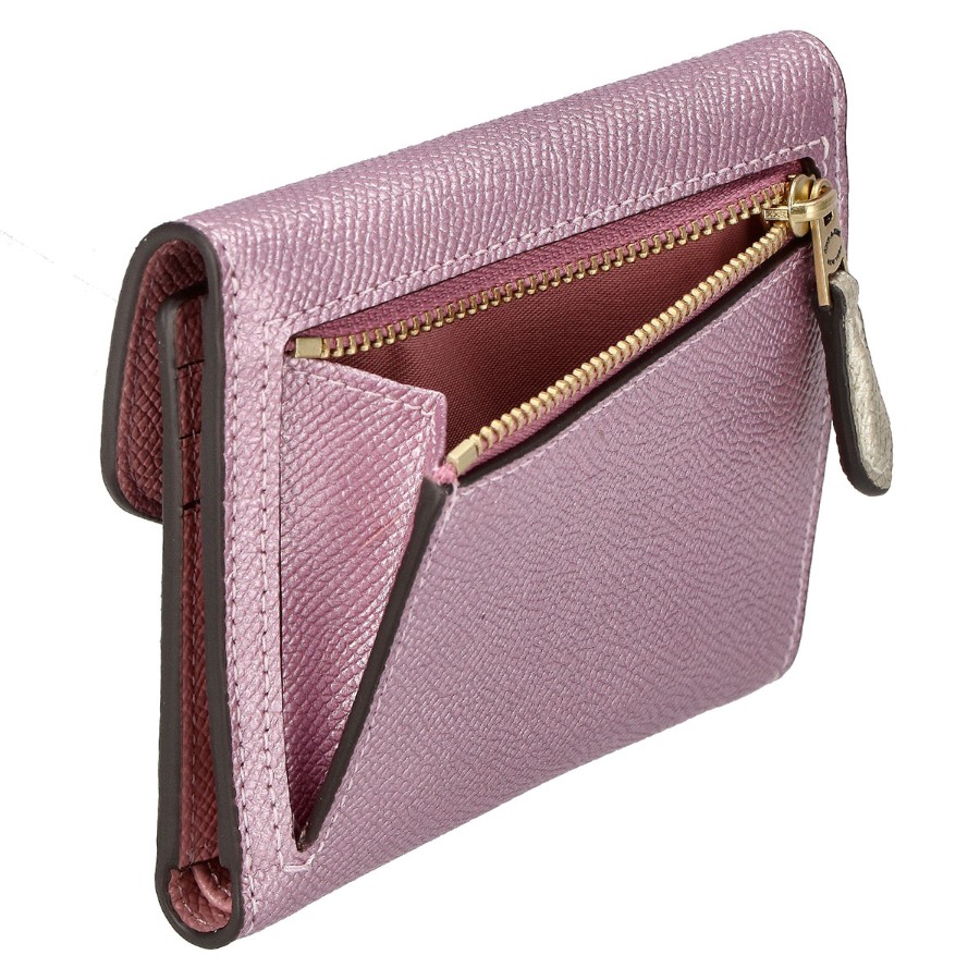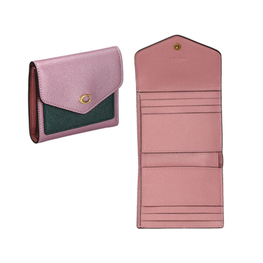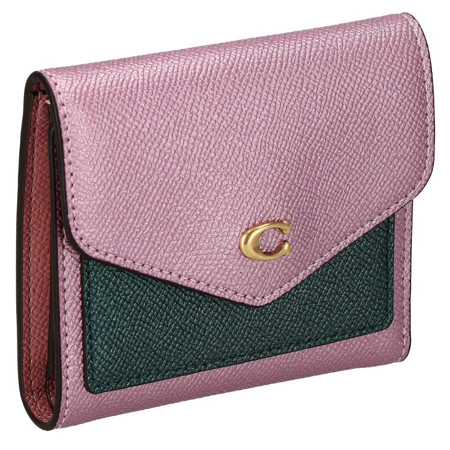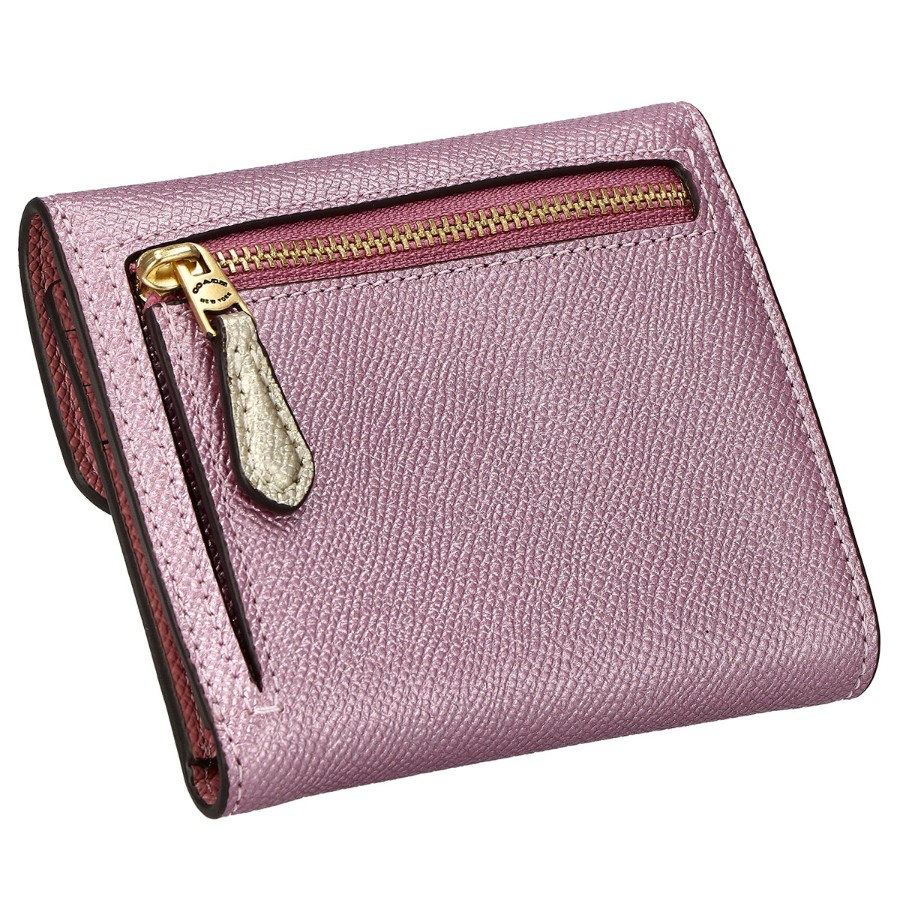 Coach tri-fold wallet with coin purse, C7210 B4OR1 CBK MTLC WYN SM WAL logo, metallic pink + multicolor.
