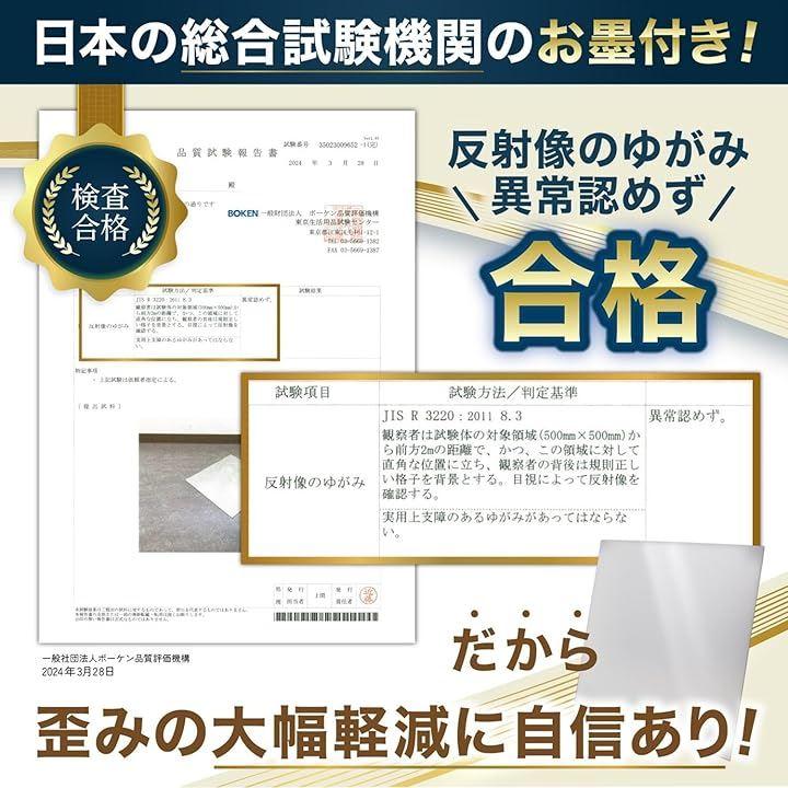 「歪み大幅軽減」従来のアクリルミラーの欠点はガラスミラーに比べて歪みがありましたが、ミラーは歪みを大幅に軽減しています。